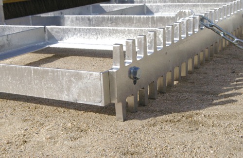 グラウンドやテニスコートの表面を均一にし、ゴミや小石を取り除くための清掃・整備用具です。