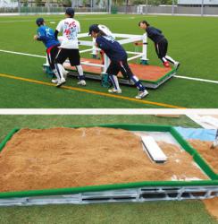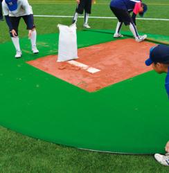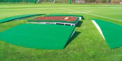●フレーム/鉄製、メッキ仕上げ、人工芝貼付●ピッチャープレート/硬質ゴム、土台/再生プラスチック●φ5480×H254mm●340kg●移動用台車付属●アメリカ製※写真の色は実際の色とは多少異なります。※中央部パーツは、本格的なピッチングができるようマウンド用土で固めていただきます(お客様手配)。【移動式】