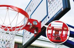 校庭解放時・夜間にゴールを使用させない ハンドルでロックを解除すれば、リングをはね上げて使用できない状態にすることができます。 危険回避・近隣への配慮のために役立ちます。
