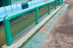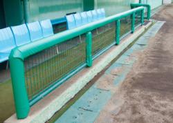ダッグアウト柵用の防護マットです う柵に防護マットを取り付けることで、選手の安全に配慮しています。 柵の寸法に応じてマットの長さ・厚みを加工いたします。
