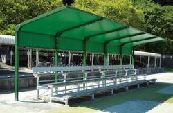 ●柱/鉄製、メッキ処理後焼付塗装、□125×75mm、□75mm(屋根)●屋根材/シート張【PHOTO:拓殖大学(東京都八王子市)】※ルイ・ステージは別売です。※写真は5連棟となります。※シェルターテント式大型は、風速34m/s、地表面粗度区分Ⅲで設計しております。(建築基準法施行令第87条に基づく)※耐雪仕様は地域により条件が異なりますので、都度ご確認下さい。※屋根材は国土交通大臣認定の不燃材料を使用しています。(認定番号NM-5063)【鉄製】【テントシート】【要施工】