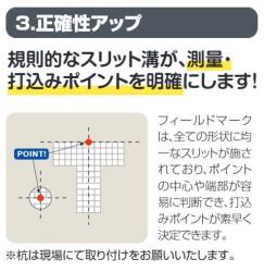 安全性と施工性を向上させるフィールドマーク 表面のスリットがスベリを抑え、安全性が向上し、ドリル状の1本杭は打ちこみやすく抜けにくい構造です。