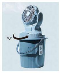 水道や電源がない場所でも使えるコードレスミストファン。電源不要のコードレス設計で24Vのリチウムイオン電池で動作し、電源が取れない場所でもコンセント不要で使用できます。バケツが満水状態で、約4〜7.5時間のミスト噴霧が可能で、体育祭などの行事や屋外の作業でも安心して活用できます。給水方法は「ポンプでバケツから」と「水道直結」の2種類選べ、FAN部分は、使わない時はバケツに収納可能です。充電時間:約2~5時間で、左右への自動首振り機能もあります。