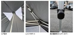 熱中症対策に優れているスーパーテント天幕の垂れ幕部分の裏側には、マジックテープが付いているので、別売の横幕や案内幕などを簡単に取り付けることもできます。※生地の性質上、天幕の表裏に凸凹ができ裏面の加工時にムラができますが、遮熱効果には影響いたしません。※ワンタッチテントは常設用ではありませんので、強風や豪雨時などでのご使用はお控えください。