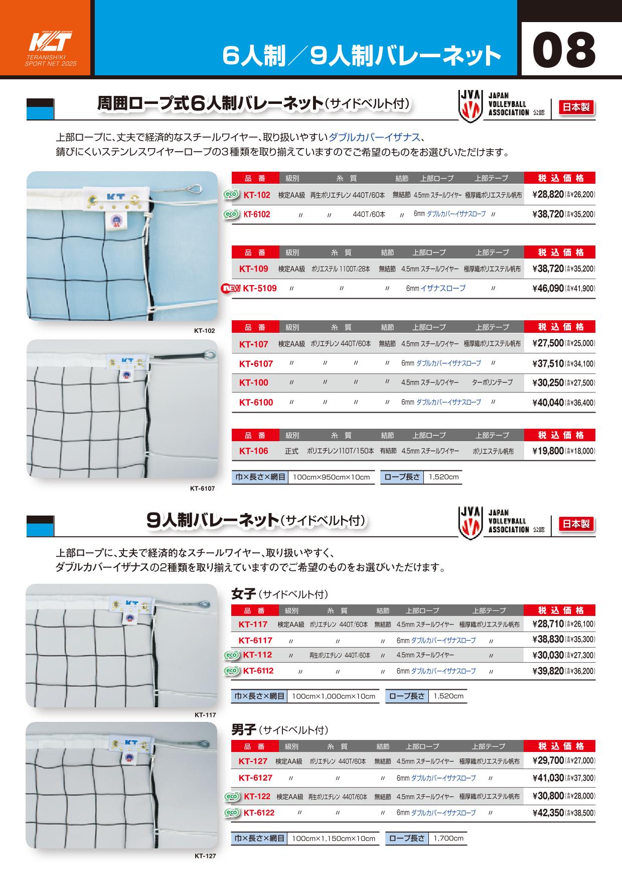 KT-6107 6人制バレーネット 検定AA級 規格:ポリエチレン440T/60本 寺西喜商店(TERANISHIKI)