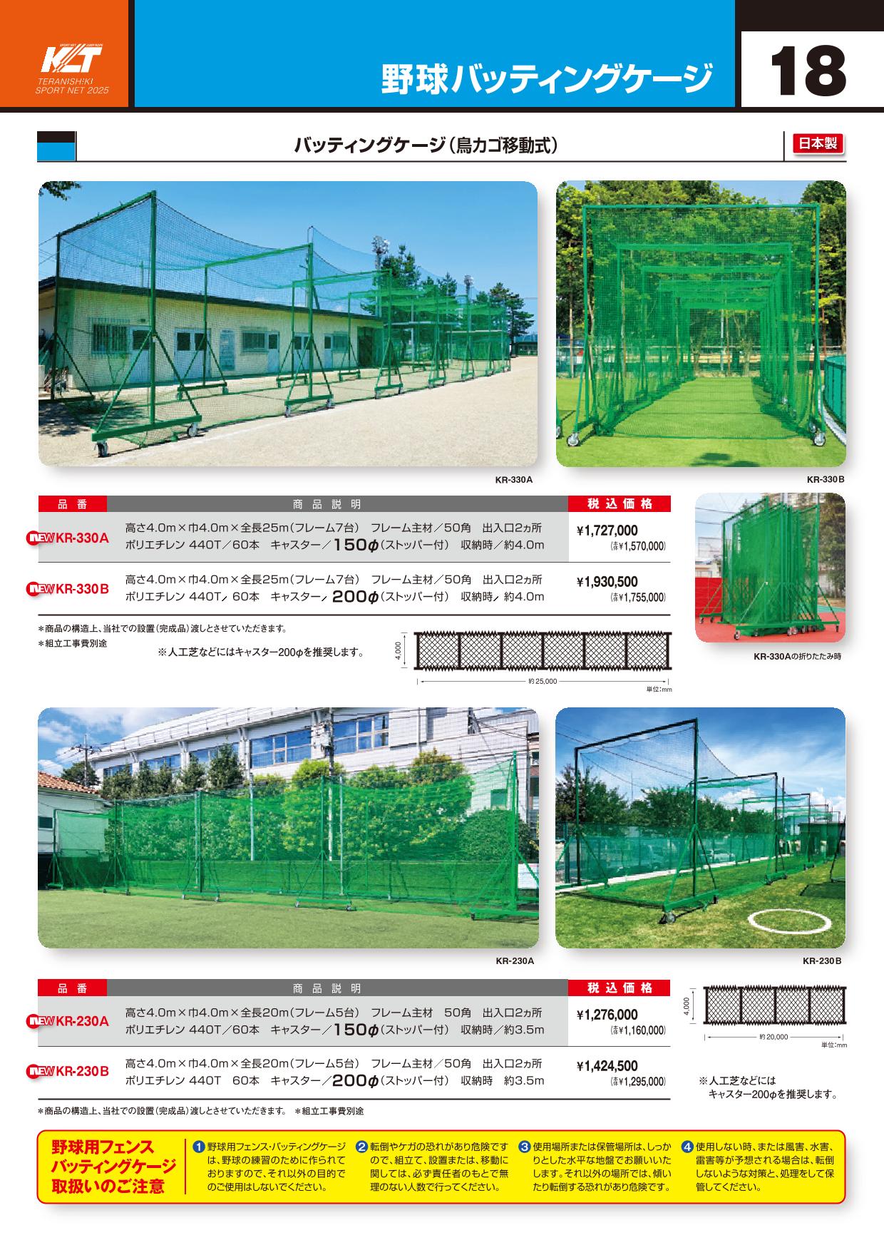 KR-230A 折畳式バッティングケージ 4面 規格:W4.00m H4.00m D20.00m キャスター150Φ 現場組立式 寺西喜商店(TERANISHIKI)
