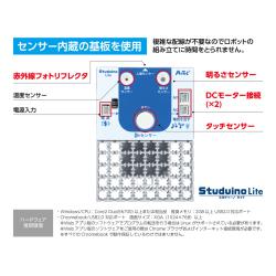 商品サイズ:基盤サイズ:111×80×20㎜セット内容:Studuino Lite×1、電池ボックス(単3電池3本)×1、DCモーター×2、USBケーブル A-microB(長さ:80cm、USB 2.0)×1、アーテックブロック基本四角(白)×2、アーテックブロックハーフD(白)×2、回転軸・黒×2、丸(目玉)×1、タイヤ×4、タイヤゴム 太×2、重量:339(g)材質:Studuino Lite Wireless:PCBなど、電池ボックス:ABS・PP、DCモーター:ABS・PVC、USBケーブル A-microB(長さ:80cm、USB 2.0):PVC、アーテックブロック:ABS、回転軸(黒):ABS、丸(目玉):ABS、タイヤ:ABS、タイヤゴム:シリコンゴム梱包形態:袋入り梱包サイズ:210×310×45(mm)製造国:中国