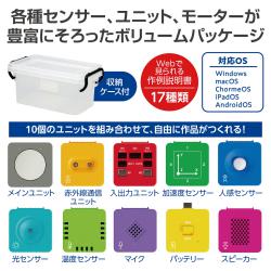 商品サイズ:各種ユニット:約35×35×19mm(ユニットによって多少の大きさの違いがございます。)セット内容:メインユニット×1、加速度センサー×1、赤外線通信ユニット×1、人感センサー×1、光センサー×1、温度センサー×1、マイク×1、バッテリー×1、入出力ユニット×1、スピーカー×1、サーボモーター×1、DCモーター×1、USBケーブル(typeA-C)×1、工作台紙×1重量:370(g)材質:ABS、磁石、リチウム、紙梱包形態:ケース入り梱包サイズ:280×40×197(mm)製造国:日本