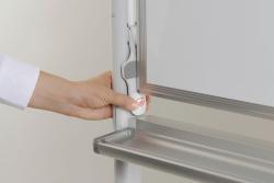 安全を考慮したプラスチックコーナーパーツと4面溝付オリジナルアルミ枠を使用しています。ボード下部でも書きやすい傾斜付!楕円パイプで安定感UP